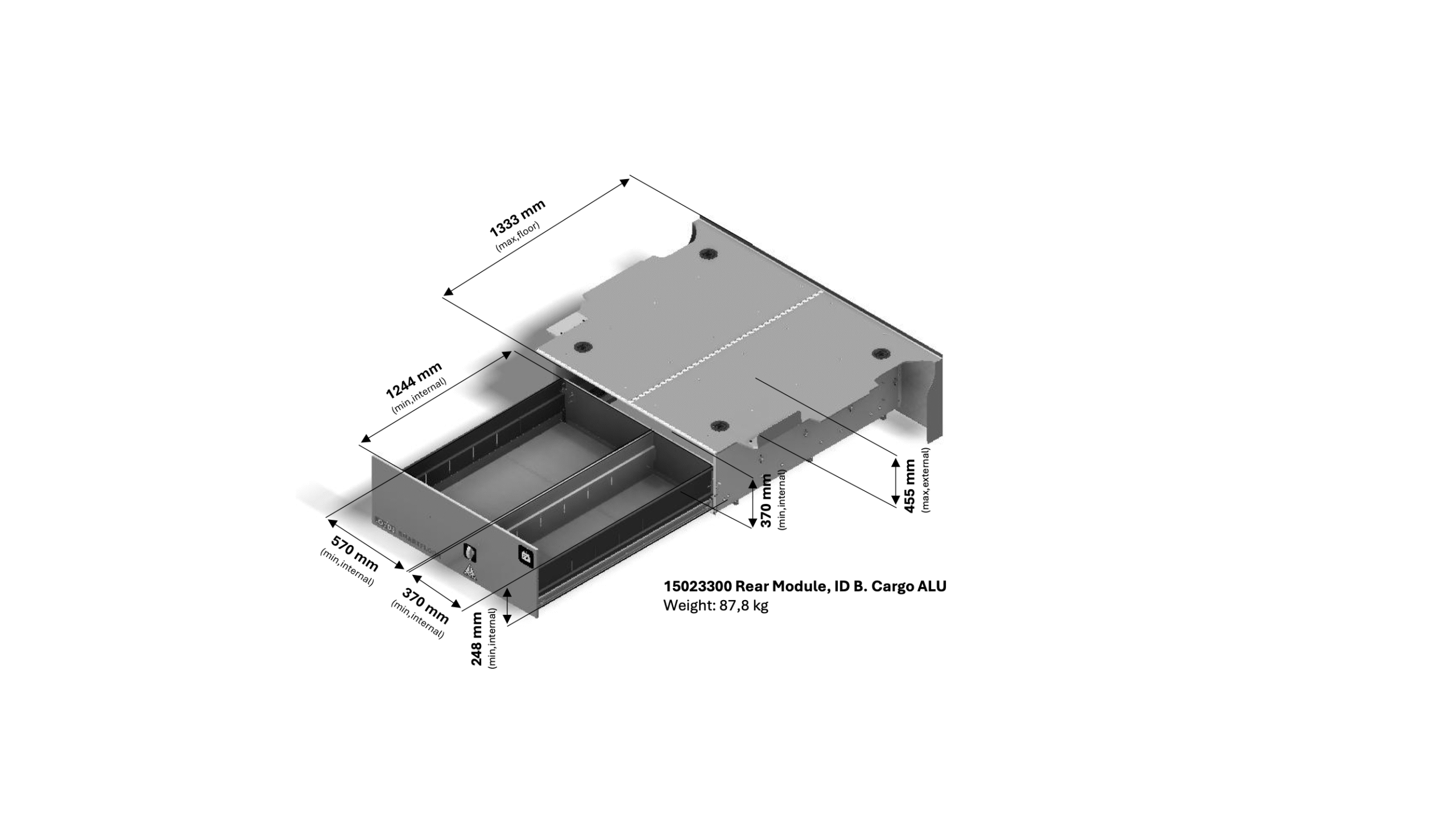 Med Smartfloor bakmodul får du en ekstra høy skuff som rommer hele 0,5 m3 og har en nyttelast på 250 kg. Du har alltid full oversikt over alt av verktøy og materiell som befinner seg i den store skuffen. Med bakmodul løsningen til Volkswagen ID Buzz Cargo har du full høyde i fremre del av varerommet, til transport av ekstra høye varer og verktøy.